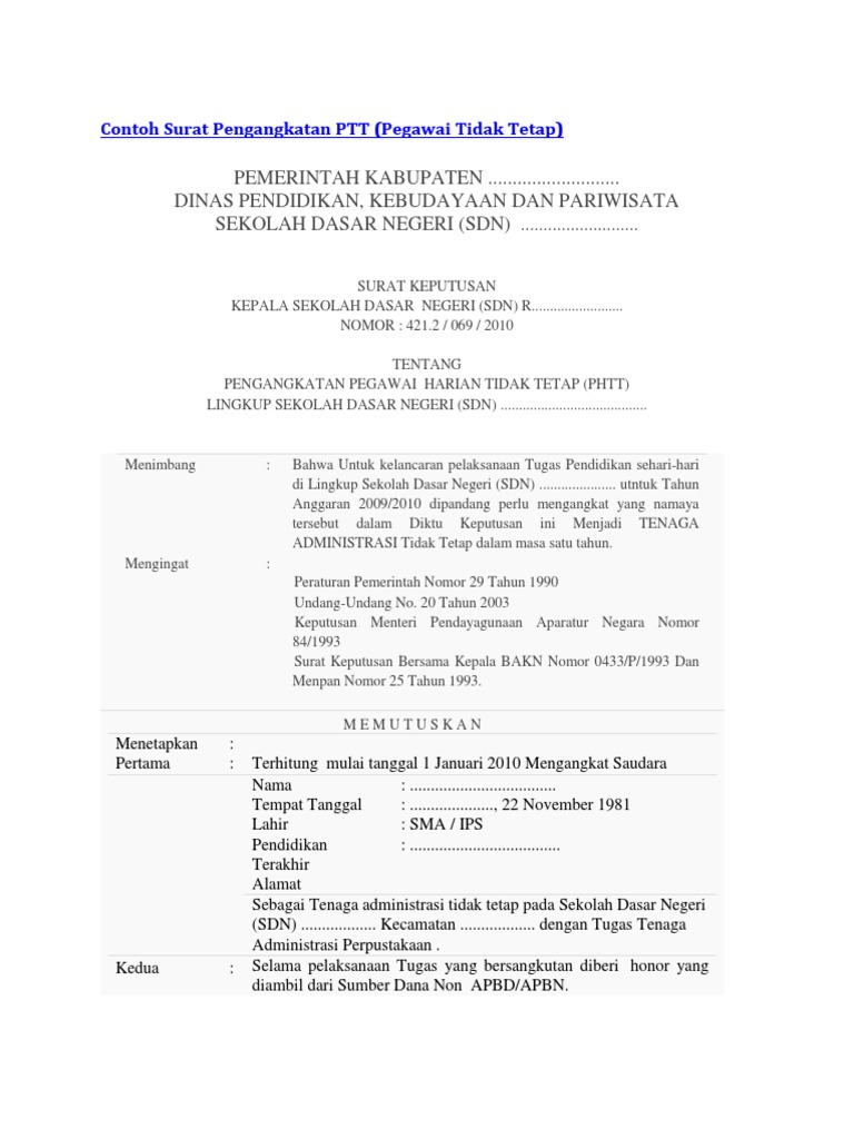 Contoh Surat Keterangan Pegawai Tetap - Contoh Surat Pengangkatan PTT Pegawai Tidak Tetap : Namun, pada umumnya surat dispensasi tersebut tetap memiliki tujuan yang sama.. Untuk karyawan walaupun cuti adalah hak tapi ada beberapa hal yang perlu diperhatikan sebelum mengambil cuti. Menunjukkan apabila surat tersebut menyertakan 3 lembar dokumen di dalam surat. Lampiran ini pada umumnya berupa dokumen untuk melengkapi informasi yang termuat pada surat. Namun, pada umumnya surat dispensasi tersebut tetap memiliki tujuan yang sama. Agar permohonan tersebut dikabulkan maka kita harus membuat sebuah surat permohonan yang ditujukan kepada pihak yang bersangkutan.